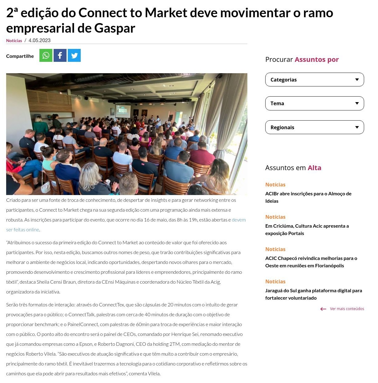 2ª edição do Connect to Market deve movimentar o ramo empresarial de Gaspar - FACISC - Hub Empresarial Catarinense