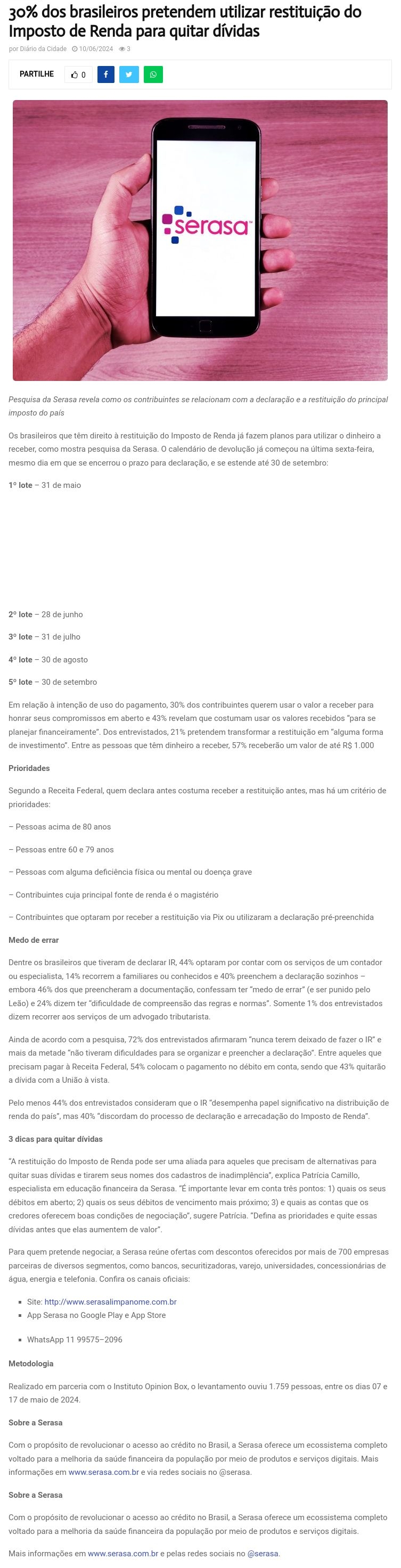 https://www.diariodacidade.com.br/30-dos-brasileiros-pretendem-utilizar-restituicao-do-imposto-de-renda-para-quitar-dividas