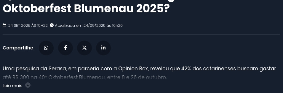 42% dos catarinenses pretendem gastar até R$ 300 na Oktoberfest 2025, revela Serasa