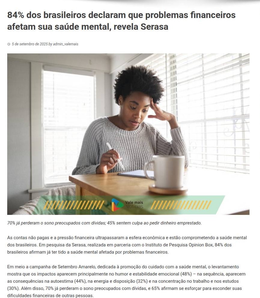 https://valemaisnoticia.com.br/2025/09/05/84-dos-brasileiros-declaram-que-problemas-financeiros-afetam-sua-saude-mental-revela-serasa