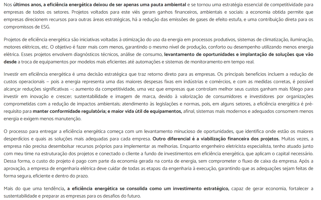 A eficiência enerética deixou de ser apenas uma pauta ambietal e se tornou uma estratégia de competitividade