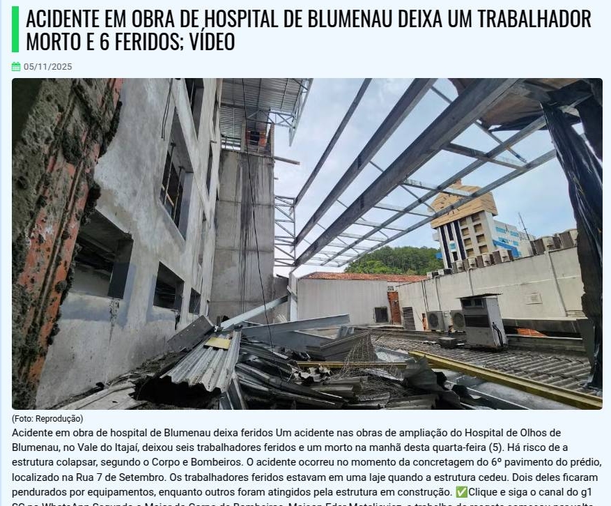 Acidente em obra de hospital de Blumenau deixa um trabalhador morto e 6 feridos; VÍDEO SERRA VERDE FM