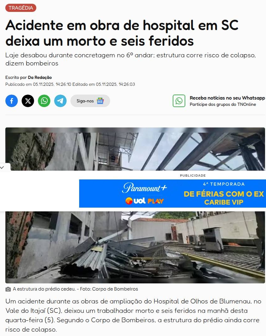 Acidente em obra de hospital em SC deixa um morto e seis feridos - TNOnline