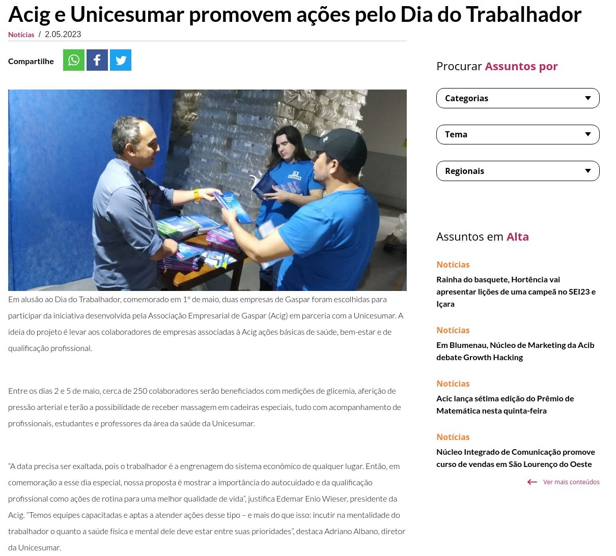 Acig e Unicesumar promovem ações pelo Dia do Trabalhador - FACISC - Hub Empresarial Catarinense
