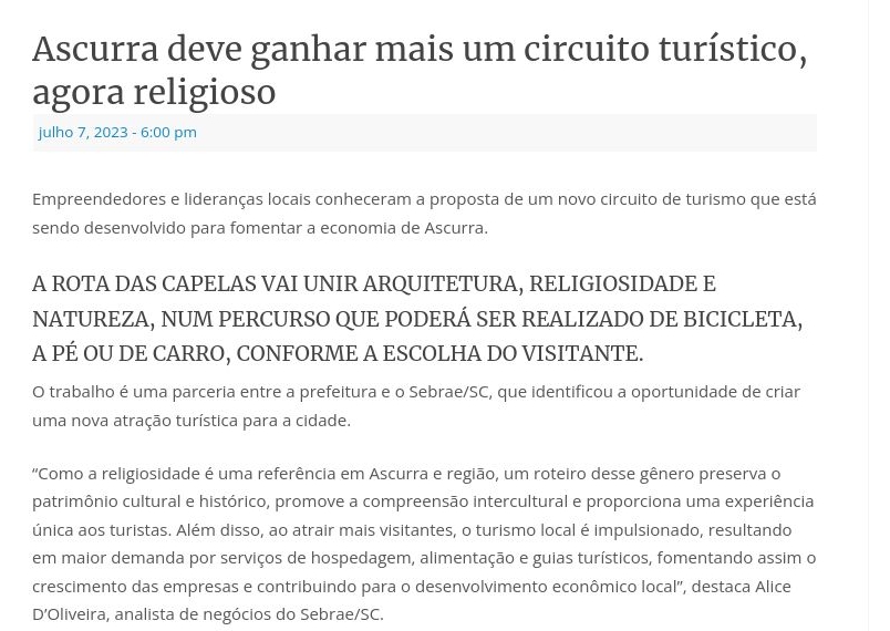 Ascurra deve ganhar mais um circuito turístico, agora religioso
