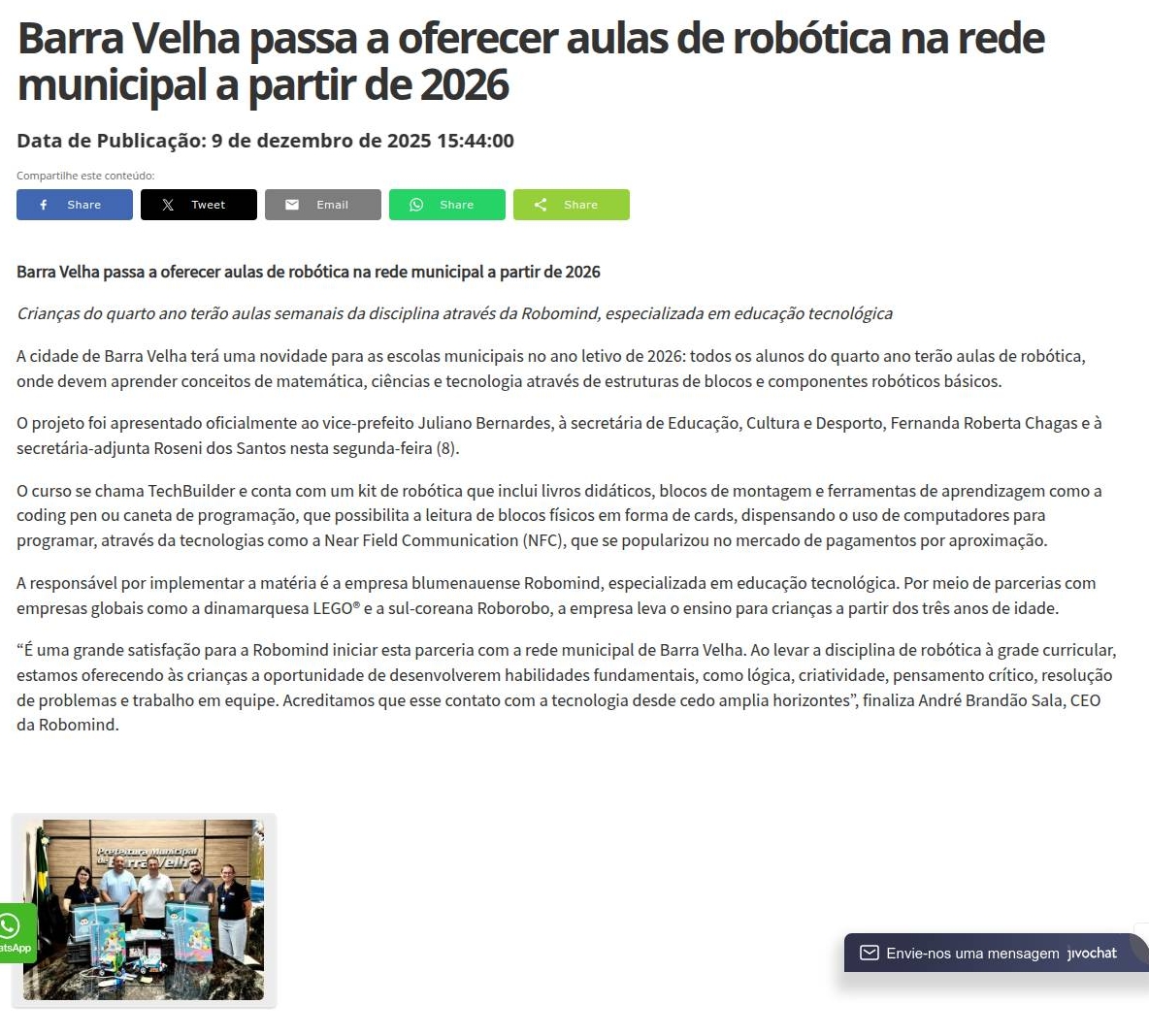Barra Velha passa a oferecer aulas de robótica na rede municipal a partir de 2026