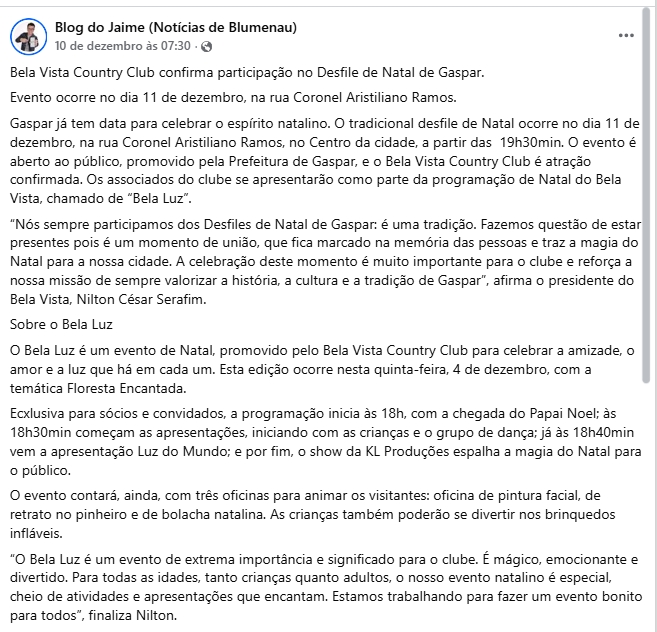 Bela Vista Country Club confirma participação no Desfile de Natal de Gaspar