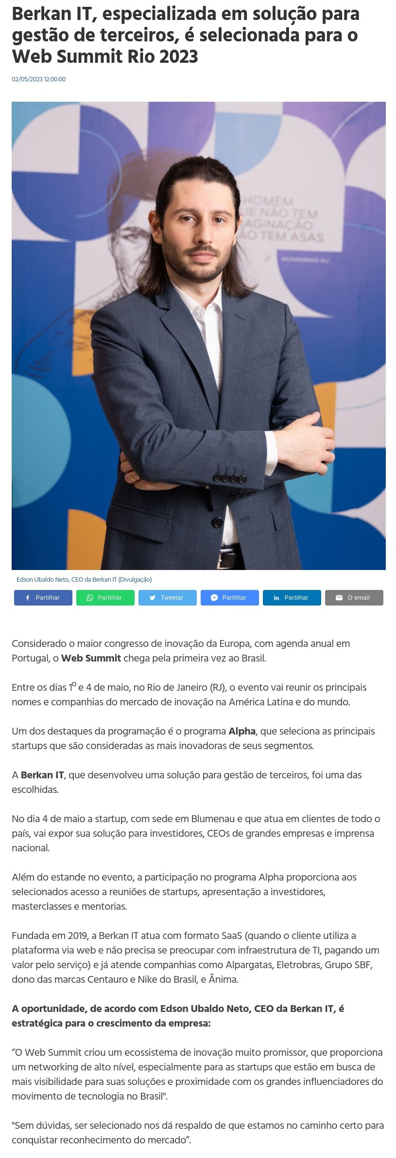 Berkan IT, especializada em solução para gestão de terceiros, é selecionada para o Web Summit Rio 2023 | Noticenter