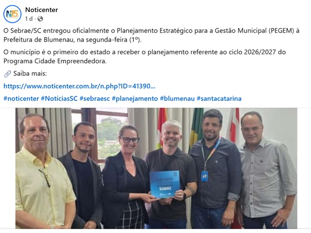 Blumenau é a primeira cidade do estado a receber planejamento de gestão do Sebrae/SC para 2026 | Noticenter