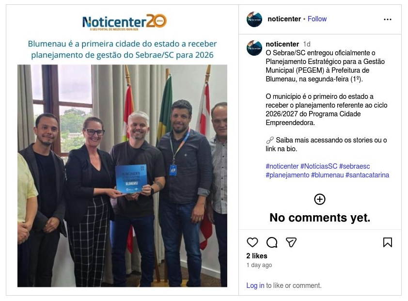 Blumenau é a primeira cidade do estado a receber planejamento de gestão do Sebrae/SC para 2026