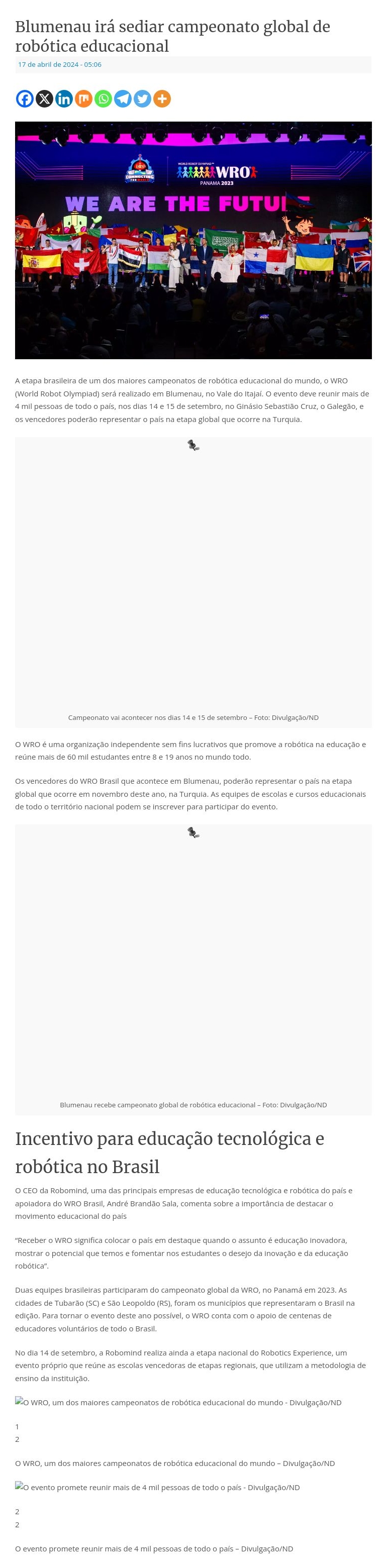 Blumenau (SC) vai receber um dos maiores campeonatos globais de robótica educacional