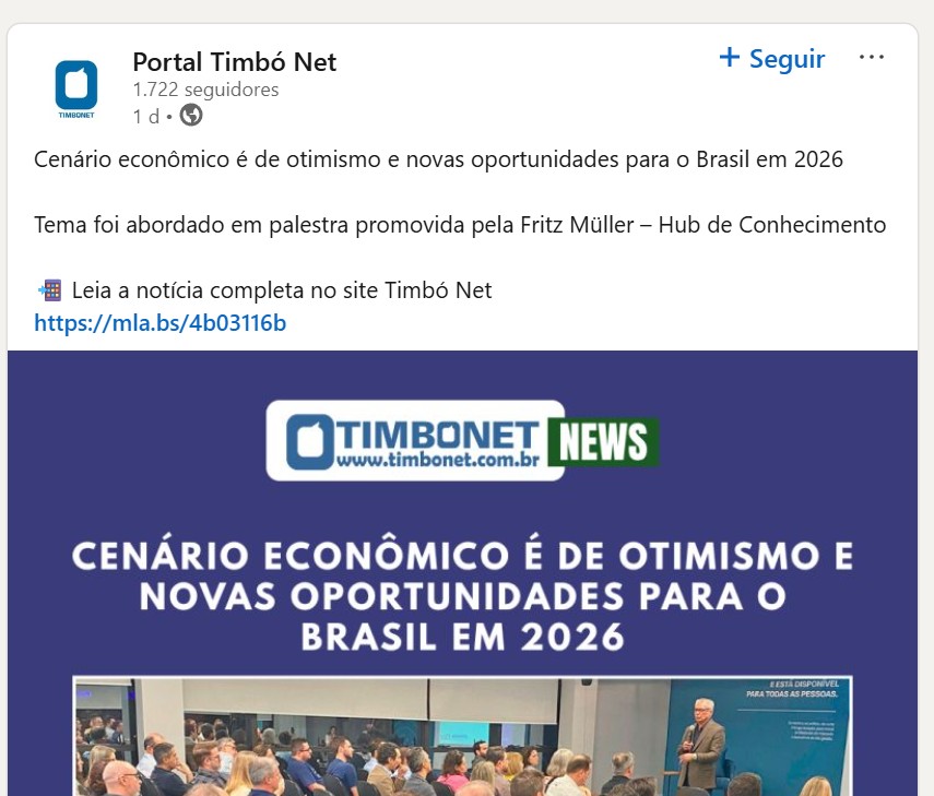 Cenário econômico é de otimismo e novas oportunidades para o Brasil em 2026 Tema foi abordado em palestra promovida pela Fritz Müller ? Hub de Conheci