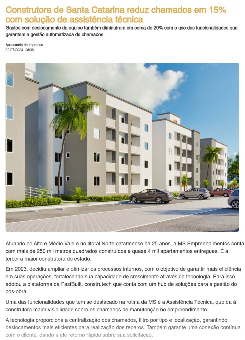 Construtora de Santa Catarina reduz chamados em 15% com solução de assistência técnica