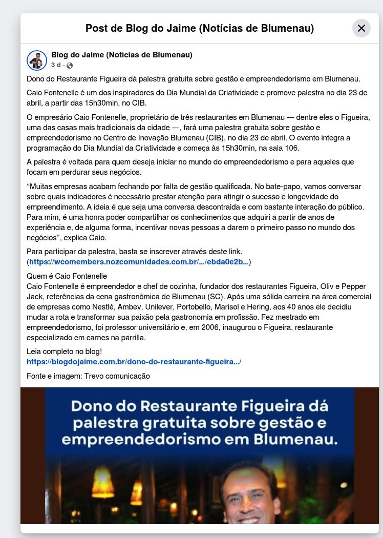 Dono do Restaurante Figueira dá palestra gratuita