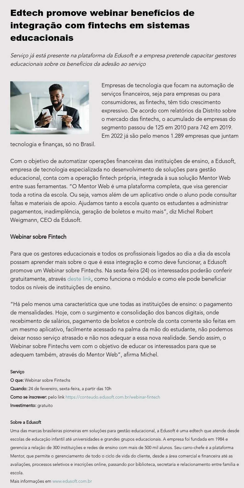 Edtech promove webinar benefícios de integração com fintechs em sistemas educacionais