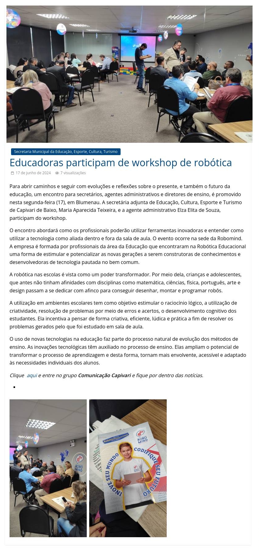 Educadoras participam de workshop de robótica - Início - Prefeitura de Capivari de Baixo