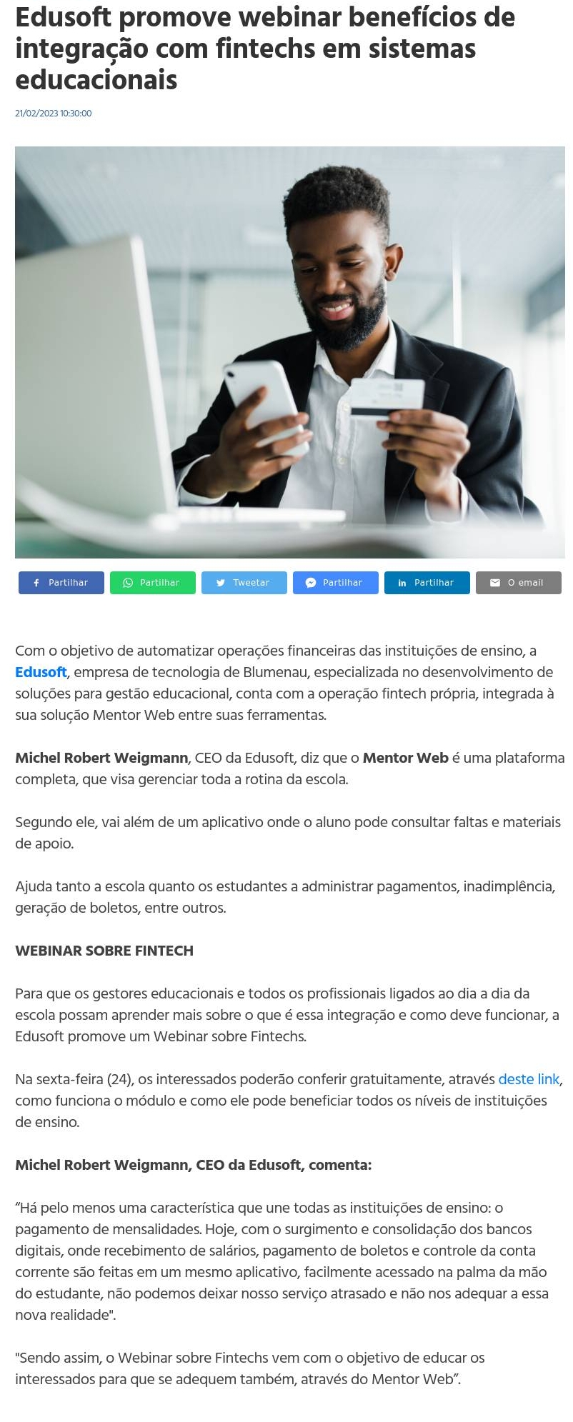 Edusoft promove webinar benefícios de integração com fintechs em sistemas educacionais | Jornal de Blumenau