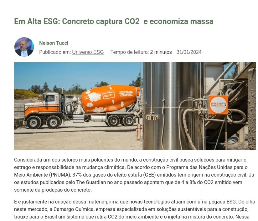 Em Alta ESG: Concreto captura CO2 e economiza massa