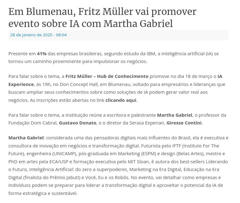 Em Blumenau, Fritz Müller vai promover evento sobre IA com Martha Gabriel