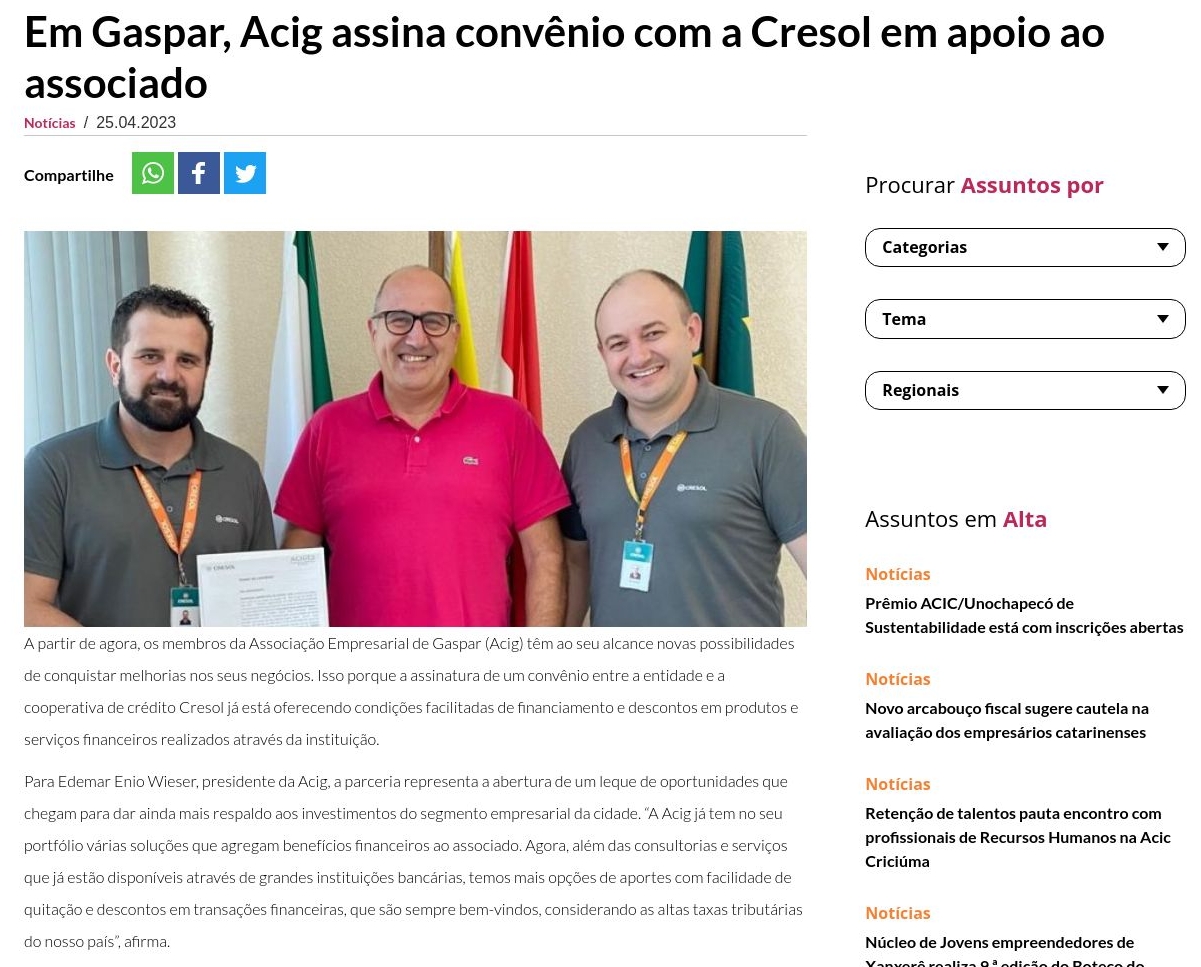 Em Gaspar, Acig assina convênio com a Cresol em apoio ao associado - FACISC - Hub Empresarial Catarinense