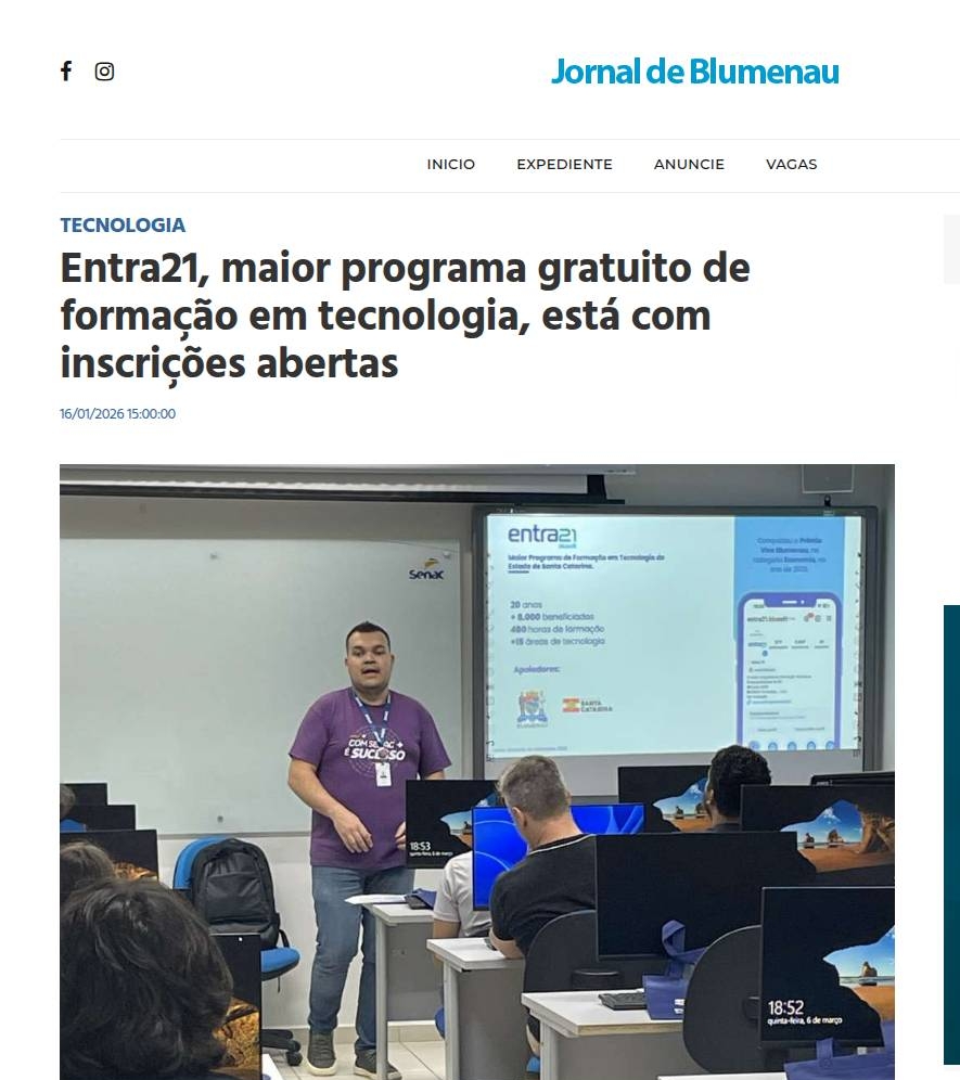 Entra21, maior programa gratuito de formação em tecnologia, está com inscrições abertas Jornal de Blumenau