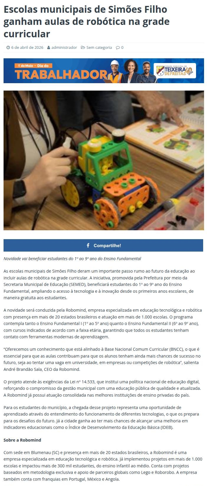 Escolas municipais de Simões Filho ganham aulas de robótica na grade curricular
