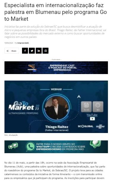 Especialista em internacionalização faz palestra em Blumenau pelo programa Go to Market