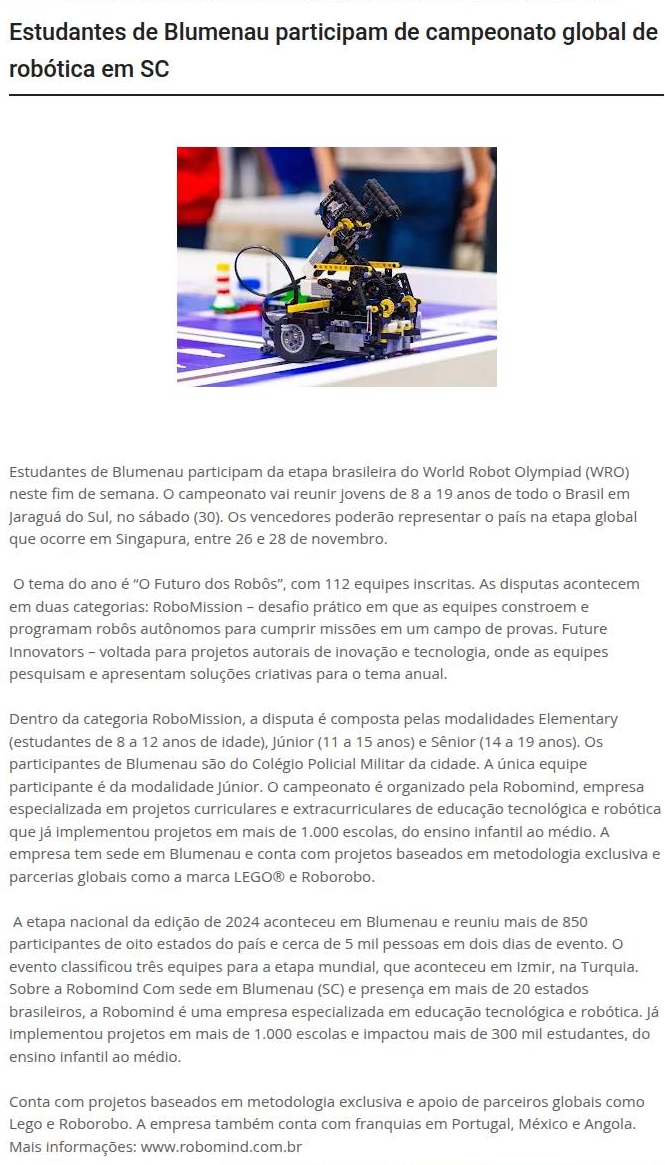 Estudantes de Blumenau participam de campeonato global de robótica em SC