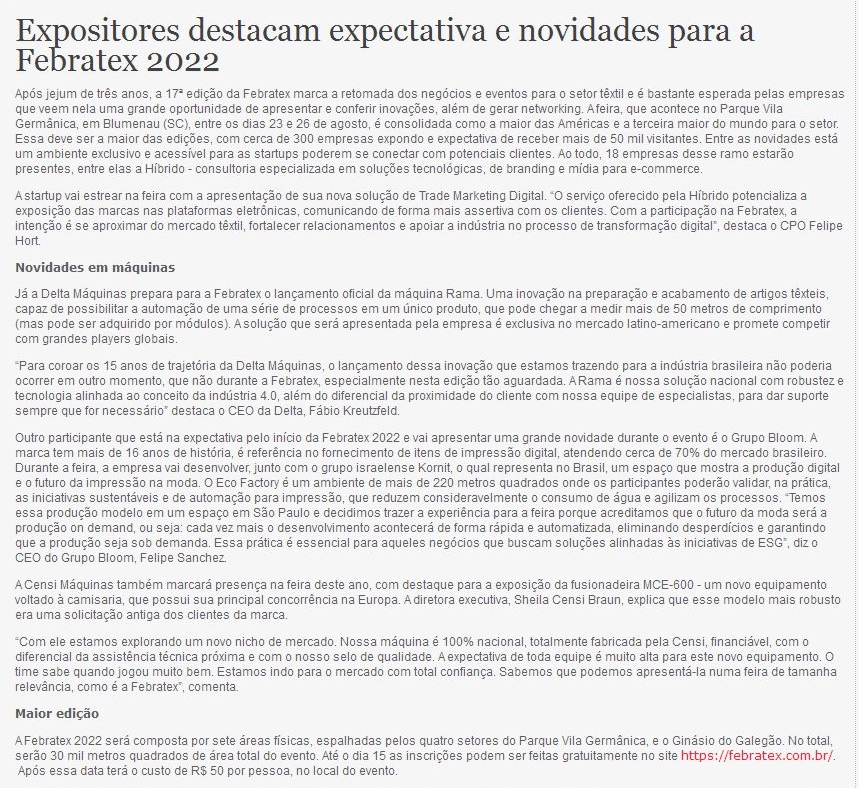 http://www.textilia.net/materias/ler/eventos/ultimas_noticias_eventos/expositores_destacam_expectativa_e_novidades_para_a_febratex_2022