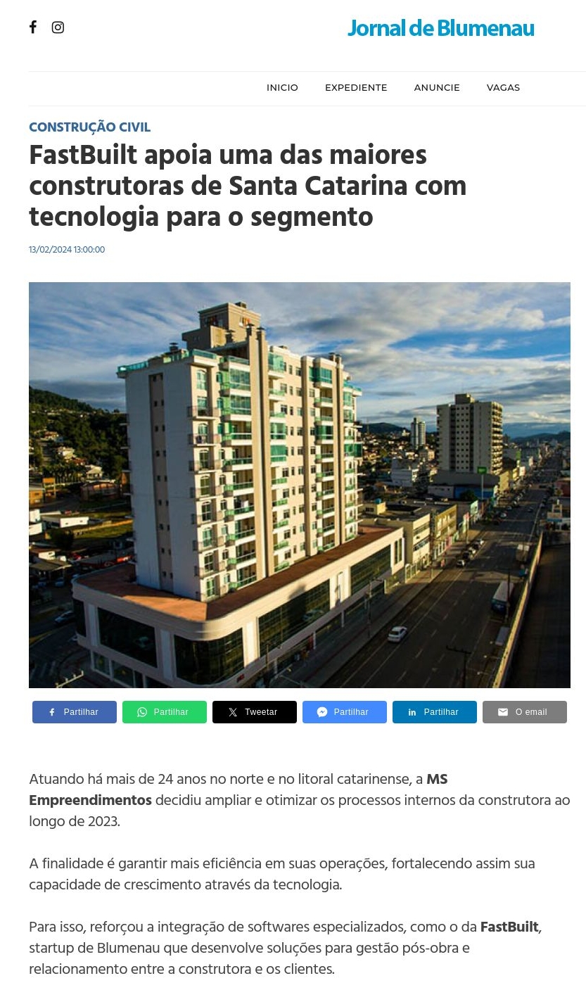 FastBuilt apoia uma das maiores construtoras de Santa Catarina com tecnologia para o segmento | Jornal de Blumenau