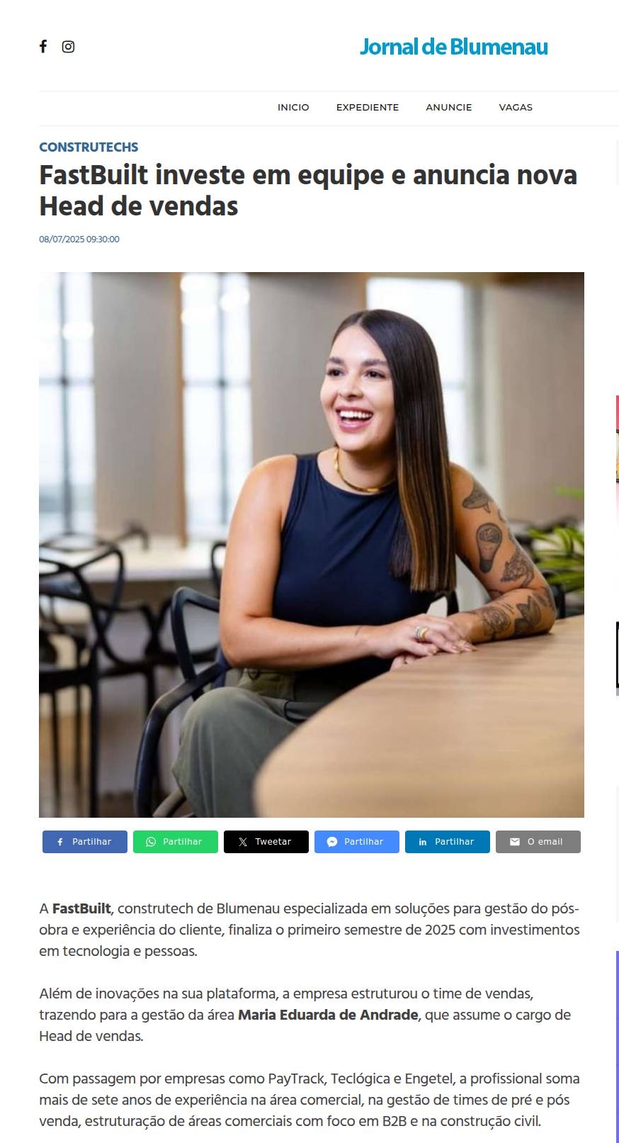 FastBuilt investe em equipe e anuncia nova Head de vendas Jornal de Blumenau