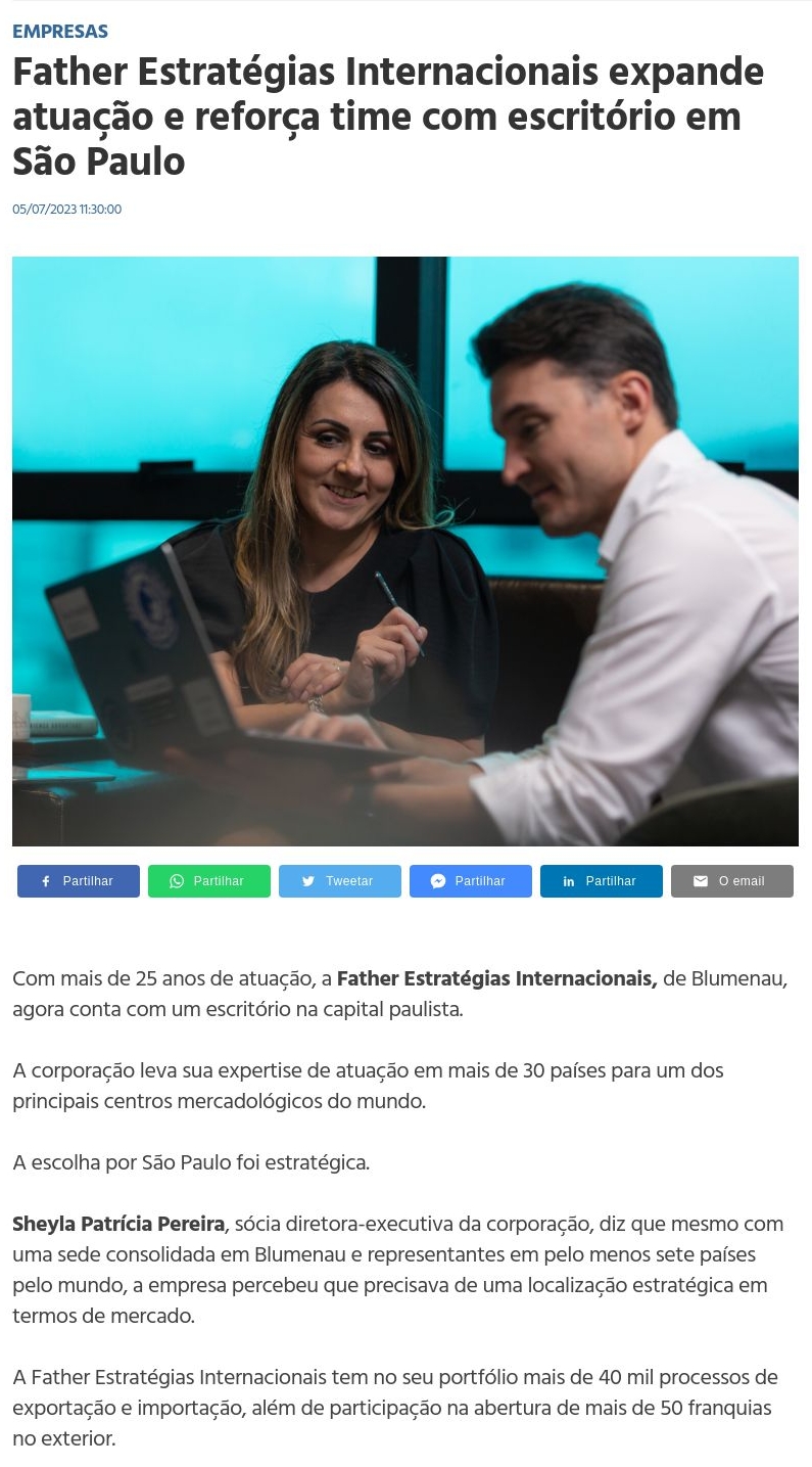 Father Estratégias Internacionais expande atuação e reforça time com escritório em São Paulo | Jornal de Blumenau