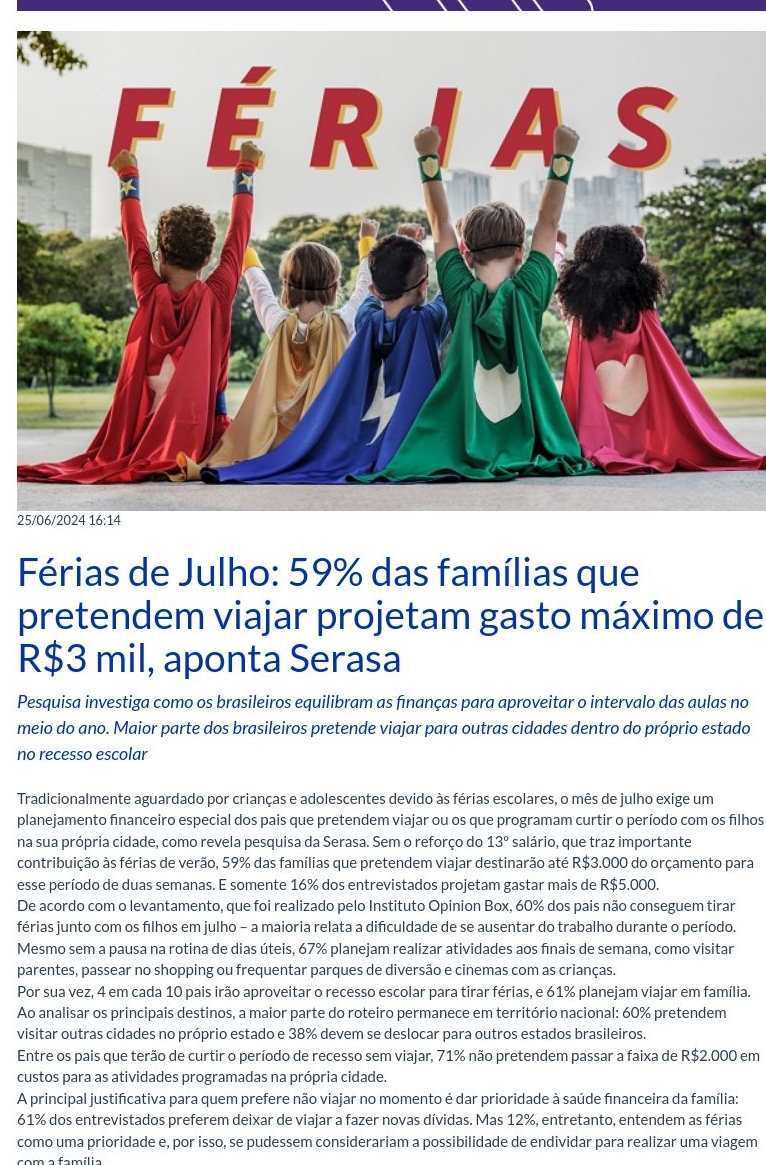 Férias de Julho: 59% das famílias que pretendem viajar projetam gasto máximo de R$3 mil, aponta Serasa