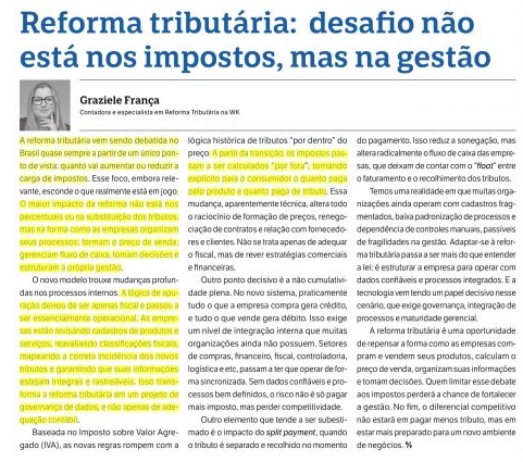 gestãoGraziele FrançaContadora e especialista em Reforma Tributária na WKA reforma tribut?