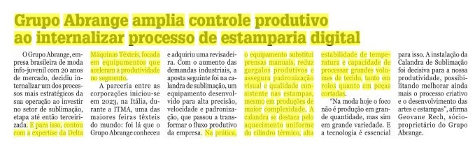 Grupo Abrange amplia controle produtivo ao internalizar processo de estamparia digital