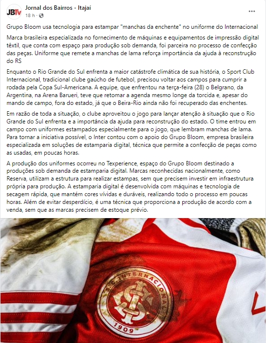 Grupo Bloom usa tecnologia para estampar "manchas da enchente" no uniforme do Internacional