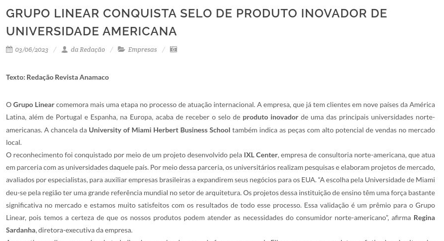 Grupo Linear conquista selo de produto inovador de universidade americana - Revista Anamaco