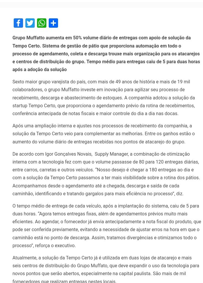 Grupo Muffatto aumenta em 50% volume diário de entregas com apoio de solução da Tempo Certo