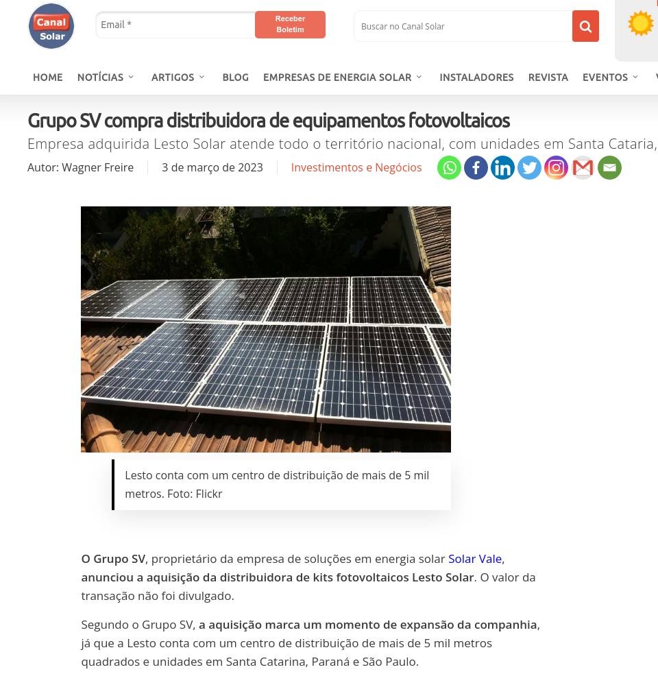Grupo SV compra distribuidora de equipamentos fotovoltaicos