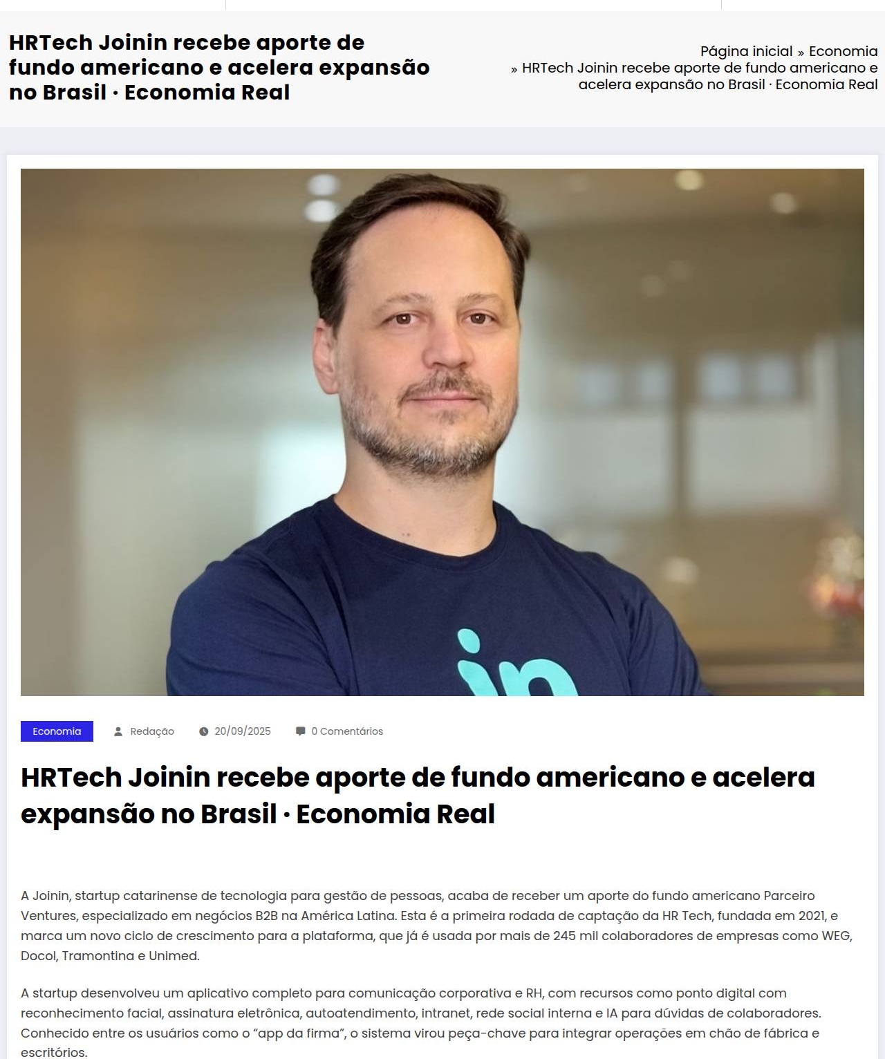 HRTech Joinin recebe aporte de fundo americano e acelera expansão no Brasil · Economia Real