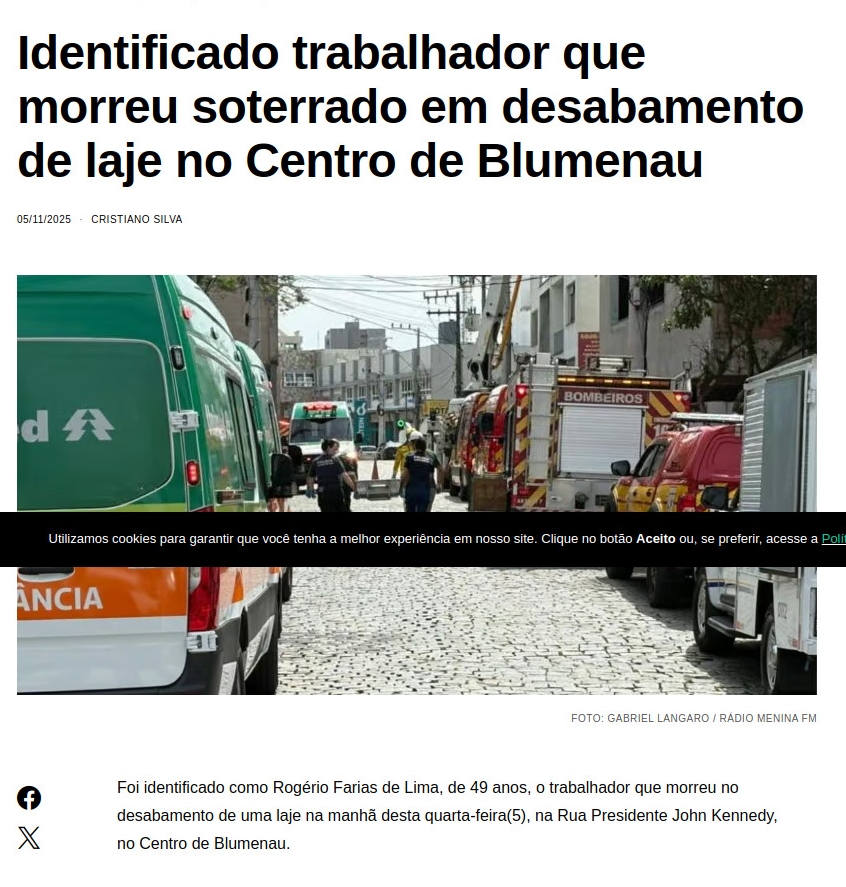 Identificado trabalhador que morreu soterrado em desabamento de laje no Centro de Blumenau Portal Menina