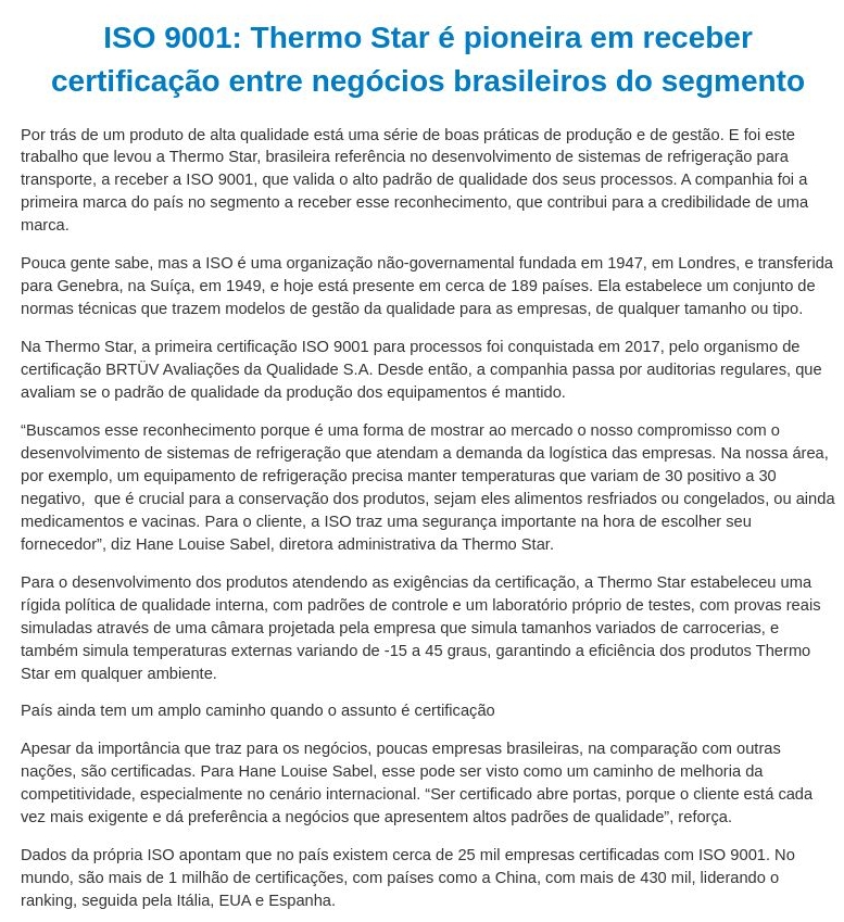 ISO 9001: Thermo Star é pioneira em receber certificação entre negócios brasileiros do segmento