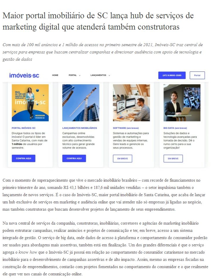 Maior portal imobiliário de SC lança hub de serviços de marketing digital que atenderá também construtoras