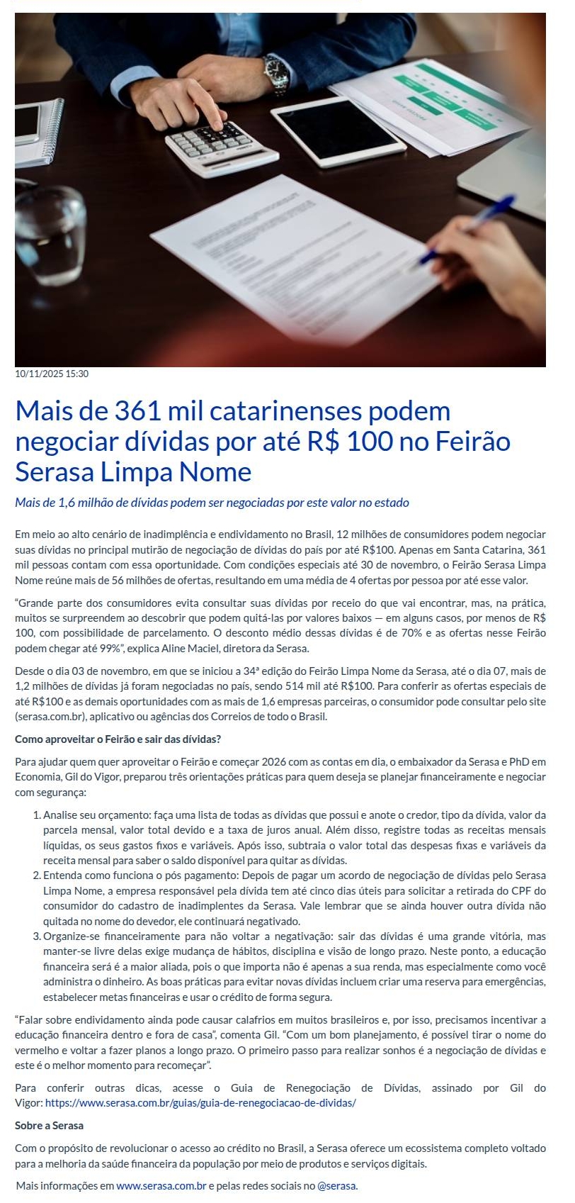 Mais de 361 mil catarinenses podem negociar dívidas por até R$ 100 no Feirão Serasa Limpa Nome