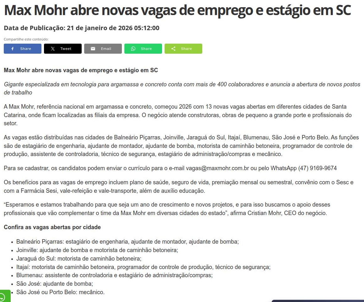 Max Mohr abre novas vagas de emprego e estágio em SC