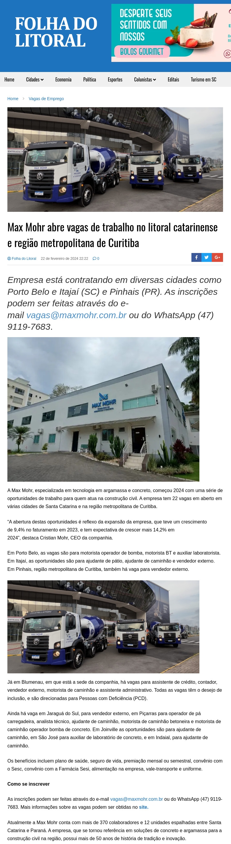 Max Mohr abre vagas de trabalho no litoral catarinense e região metropolitana de Curitiba - Jornal Folha do Litoral