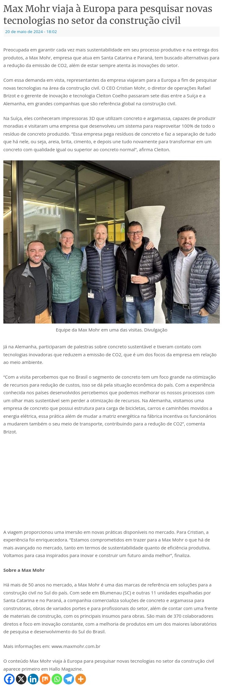 Max Mohr viaja à Europa para pesquisar novas tecnologias no setor da construção civil