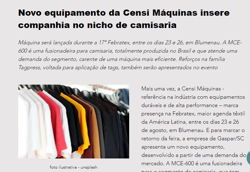Novo equipamento da Censi Máquinas insere companhia no nicho de camisaria