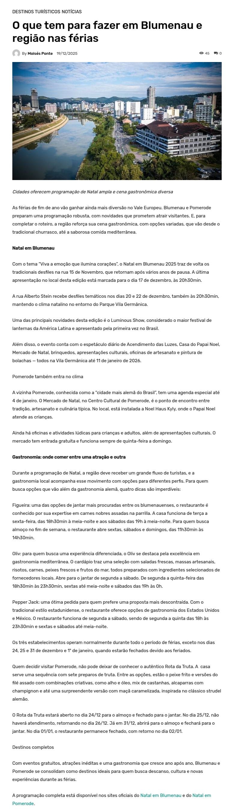 O que tem para fazer em Blumenau e região nas férias HTLNEWS - Notícias da Hotelaria e Gastronomia