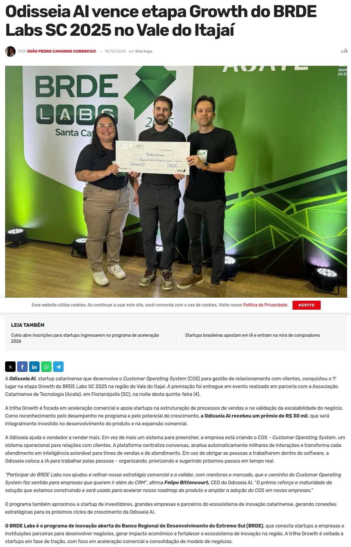 Odisseia AI vence etapa Growth do BRDE Labs SC 2025 no Vale do Itajaí